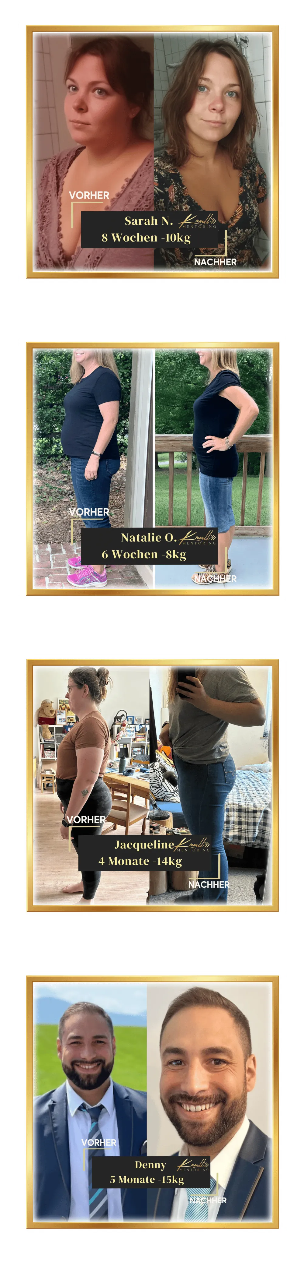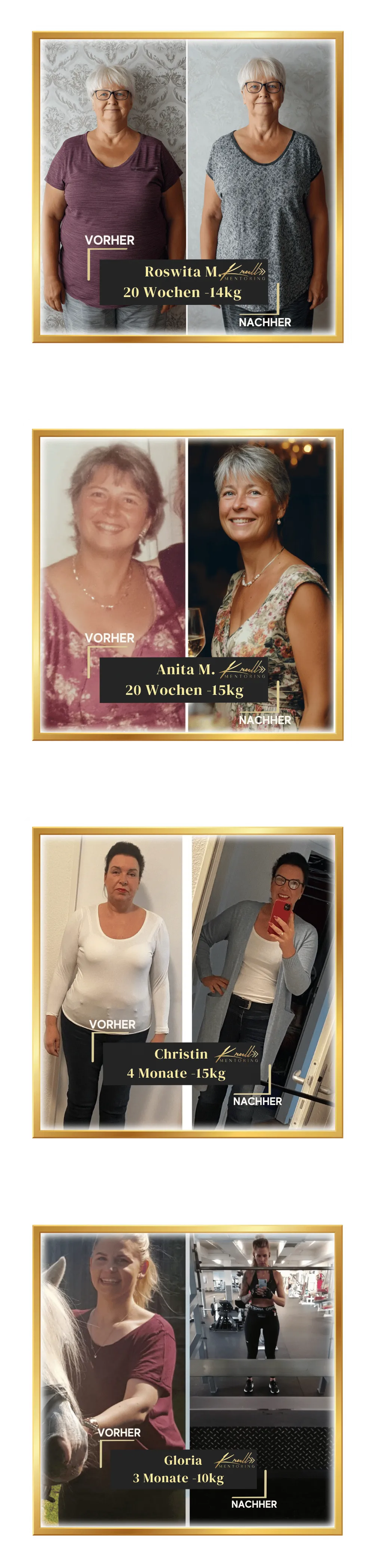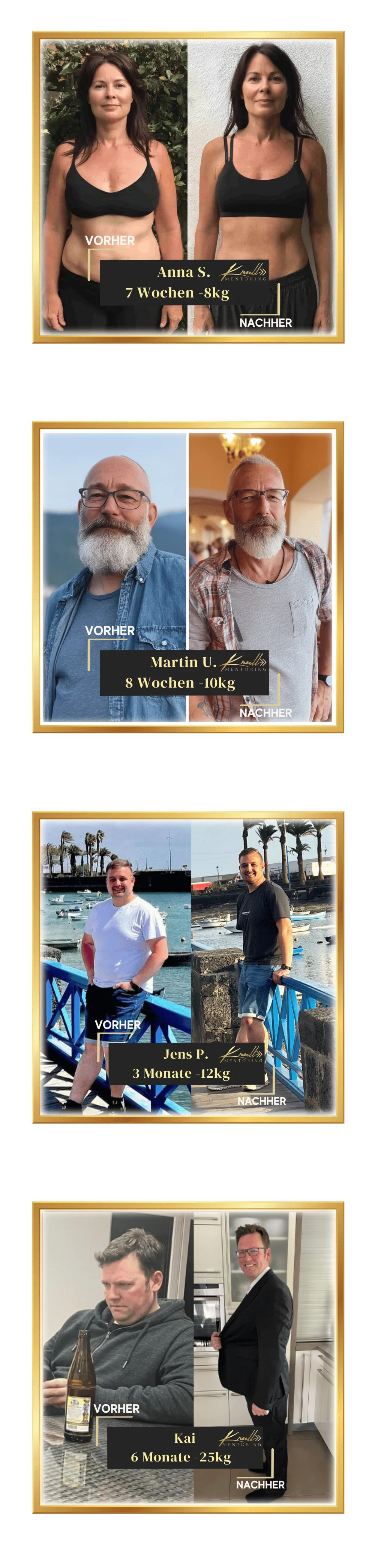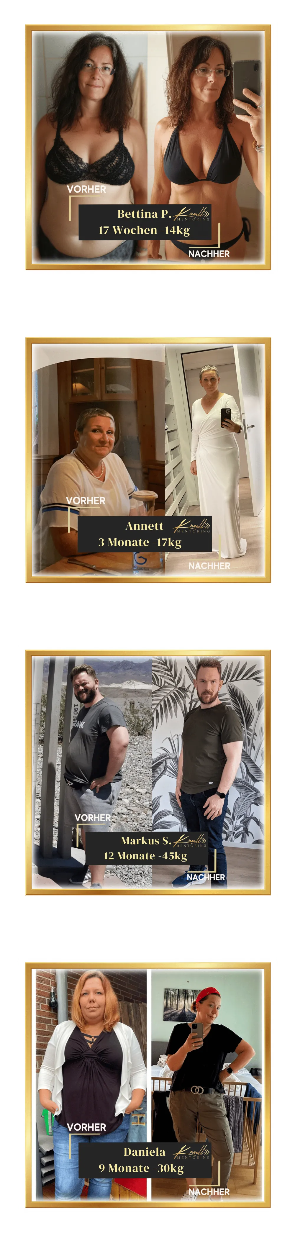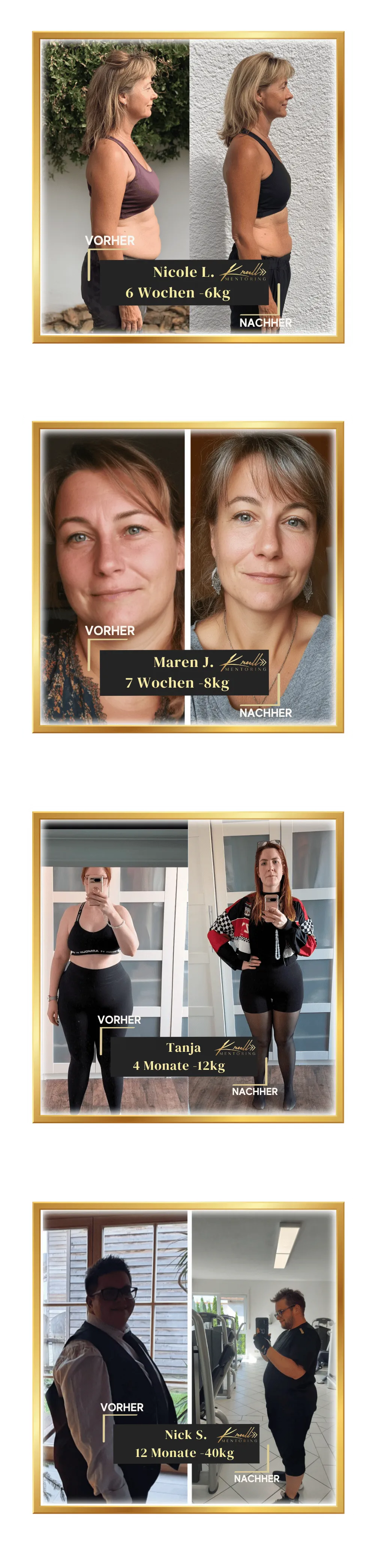 So wie all diese wundervollen Menschen mit denen wir bisher zusammen an ihrer Wohlfühlfigur arbeiten durften, bist auch du jetzt gerade nur eine Entscheidung entfernt von deiner Transformation und deutlich mehr Lebensqualität
